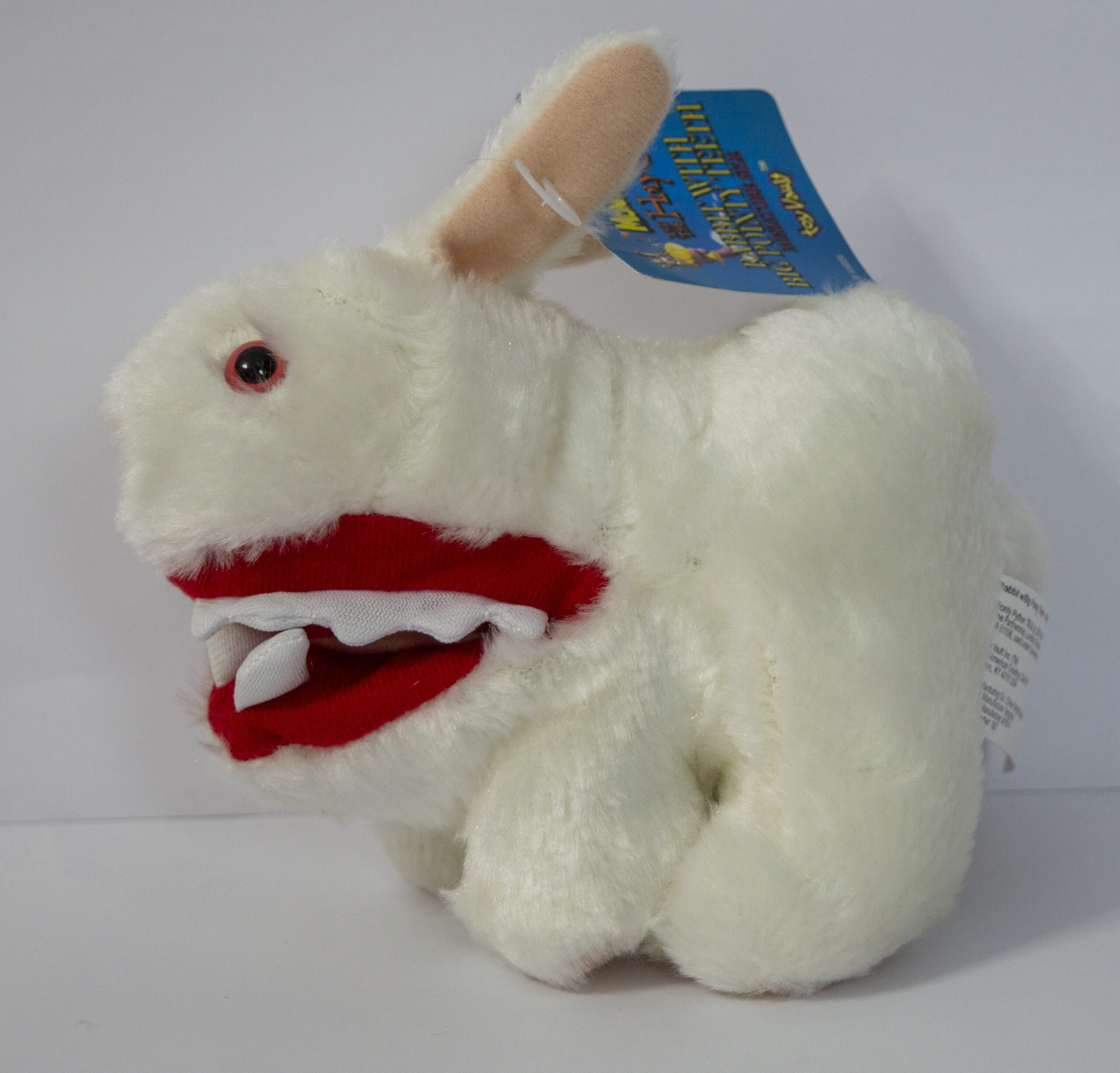Tiene una pinza interior que, al presionar, hace que abra la boca del conejo para mostrar sus peligrosos colmillos de peluche. 🙂