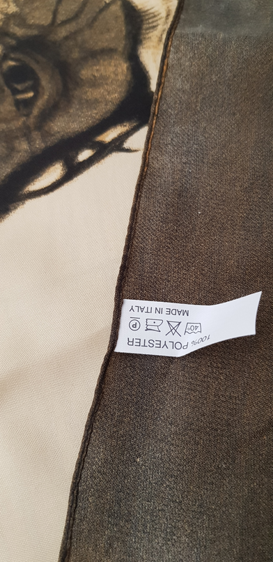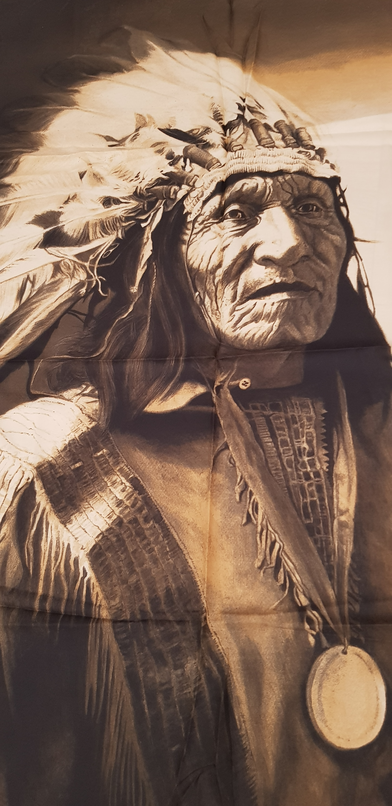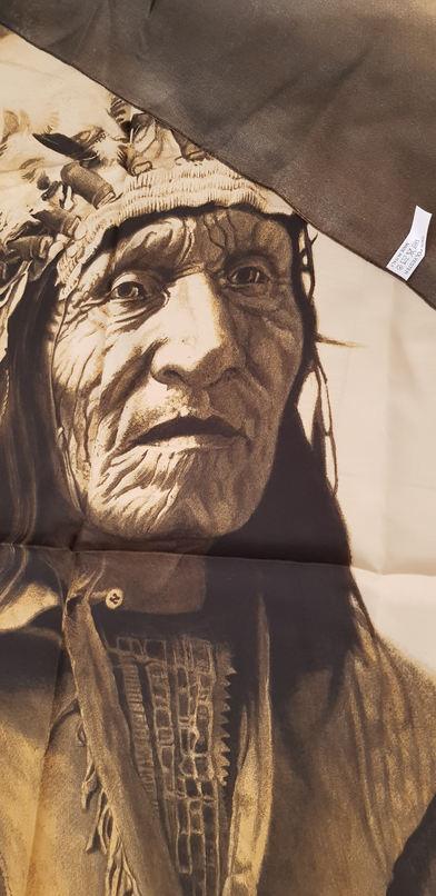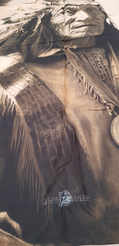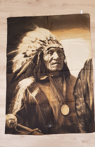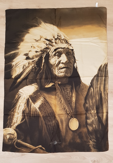El material del que está fabricado es 100% poliéster, con el dibujo de un indio nativo americano en tonos sepia.
