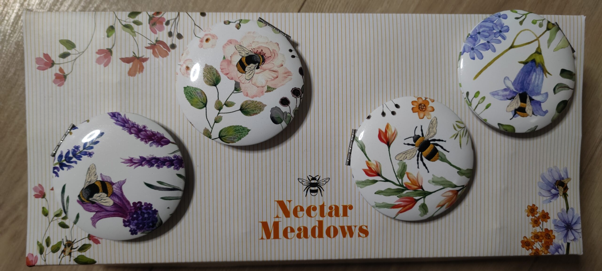 Precioso espejo de bolsillo de doble aumento con variaciones en las ilustraciones de flores naranjas, moradas, azules y rosas, y abeja.